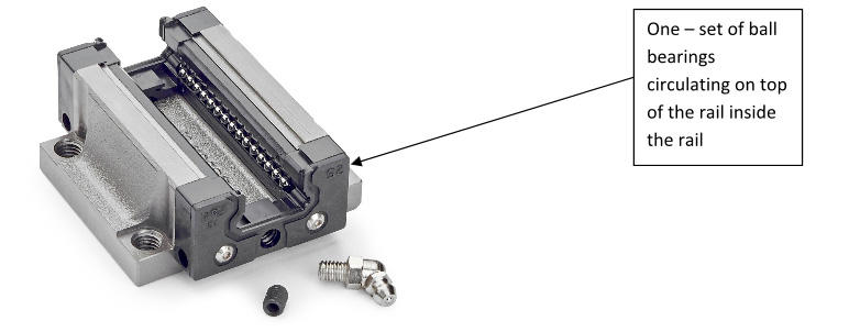 • The double-back with ball bearings architecture, uses two sets of ball bearings running back to back inside of the rail, providing high moment load capacity. The ball track groove is only slightly larger in radii than that of the balls themselves, which cradles the ball bearings as they infinitesimally flatten under load, slightly expanding the contact area between the balls and the races.